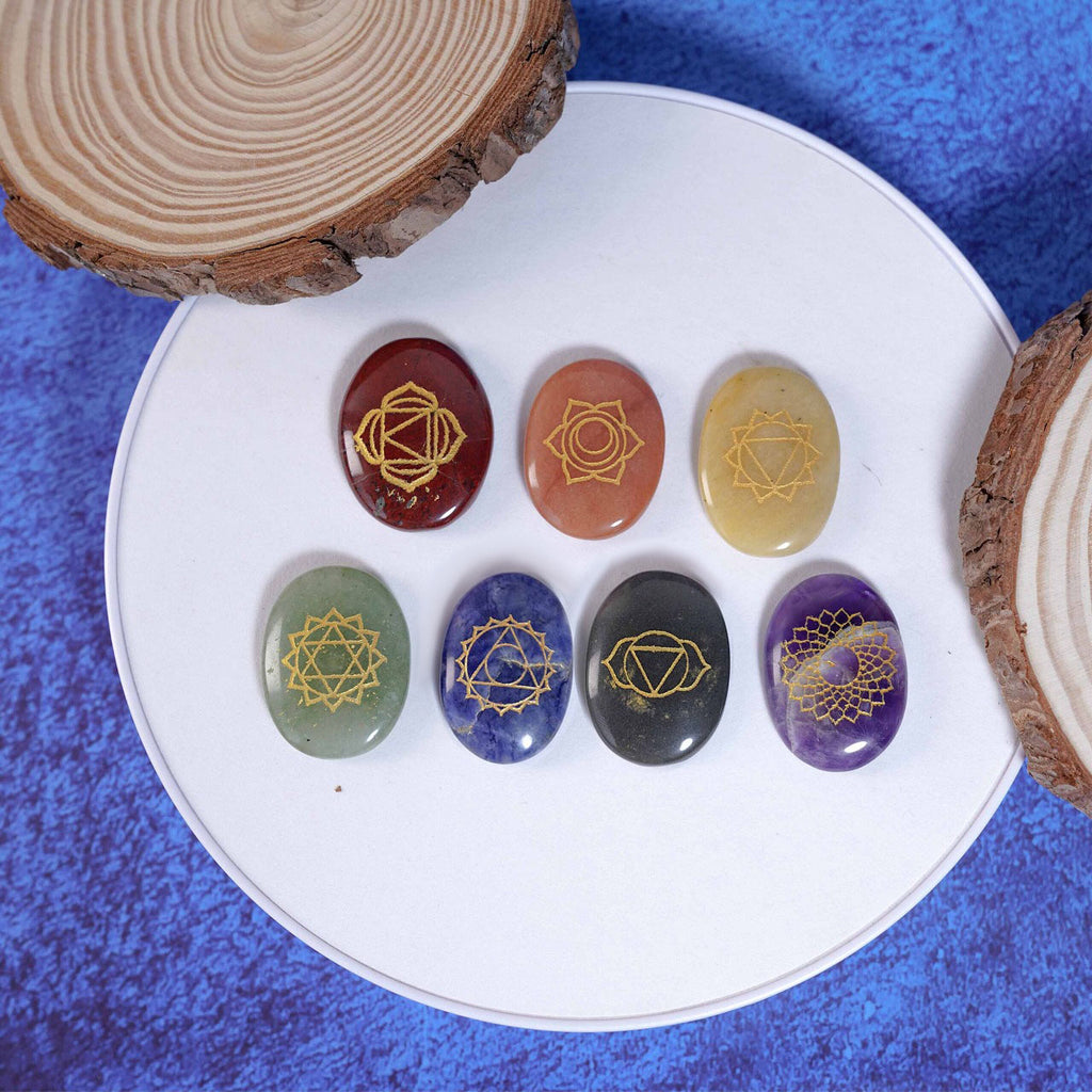 This 7-piece crystal set features polished stones etched with the sacred symbols of each chakra. Ideal for those who want both energy and intention, these engraved crystals serve as powerful tools for healing, meditation, and daily chakra alignment.