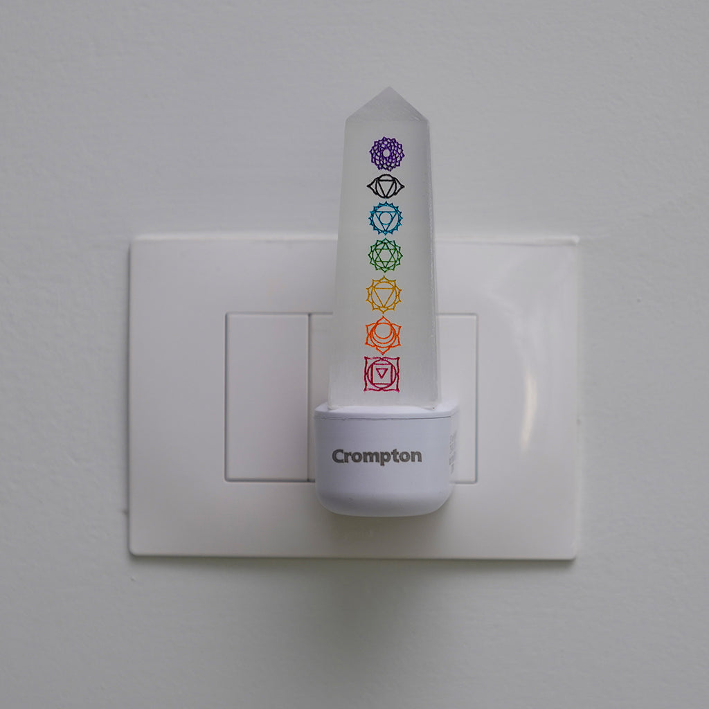 Illuminate your space and spirit with this stunning 7 Chakras Selenite Crystal Lamp. Carved from pure selenite and embedded with 7 chakra symbols, it radiates high vibrational energy that cleanses your aura and balances your chakras.