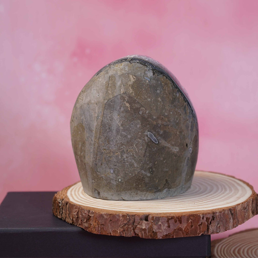 This naturally formed Amethyst Geode showcases a sparkling inner cavity of deep purple crystals. Compact yet powerful, it brings peace, protection, and elevated energy to any room or healing setup.
